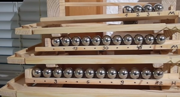 Cette horloge indique l’heure de la façon suivante : Les billes dans le plateau du bas représentent une heure puis, chaque bille dans le plateau plus haut vaut 10 minutes et finalement chaque minute est indiquée par la présence d’une bille dans le second plateau.